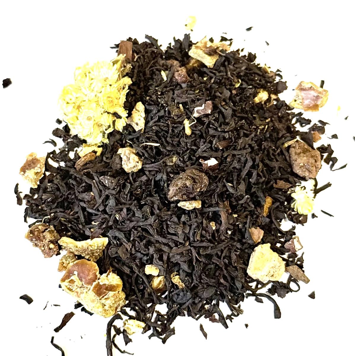 | Thé noir Assam*, -Inde du Sud*, datte (datte, farine de riz)* (24%), raisin (raisin, huile végétale)*, arôme naturel de citron, écorces de citron* (3%), fève de cacao concassée*, bâtons de cannelle*, figue (figue, farine de riz)* (3%), fleurs d'immortelle*, échinacée pourpre*.*Issu de l‘agriculture biologique. Les thés et infusions de chez Bouqu'infusions sont en feuilles et en fruits non hachés ou mixés ce qui implique de les faire infuser dans des volumes qui permettent aux feuilles de s'ouvrir et aux fruits de s'exprimer. Nous vous recommandons donc d'utiliser des théières avec filtre inox incorporé ou des filtres papier Bio dégradables et compostables vendus ici dans la rubrique "Théières et accessoires". Pour que votre infusion vous soit le plus agréable nous vous recommandons de respecter les conseils de volume au litre, de température d'eau et de temps d'infusion qui sont notés sur les étiquettes de sachets et de boîtes. |